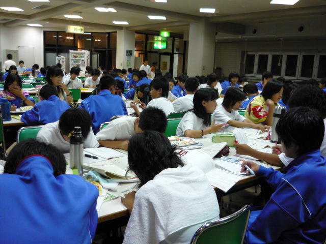 1年生の自然教室2日目の夜の風景です。入浴の待ち時間の間、食堂でテスト勉強をしています。昼間の疲れが出たのか、大きなあくびをしている生徒もいました。2日目は昼間のオリエンテーリングや竹を使った飯盒炊さんなど、盛りだくさんのメニューでした。 |