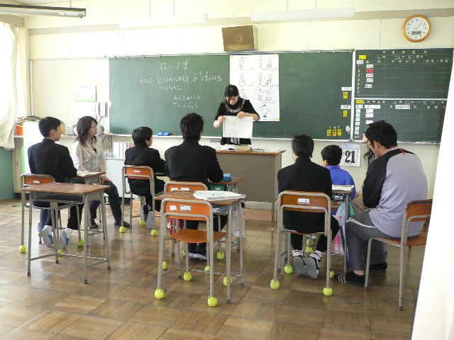 特別支援学級の英語の授業です。アルファベットを学ぶ生徒の顔は真剣そのものです。授業者は「この写真を撮る前はみんなでダンスをして、とても楽しく学習していたのに。見てもらえなくて残念。」と言っていました。毎回、身体を動かしたり、ゲームをしながら楽しく英語を学習しています。 |