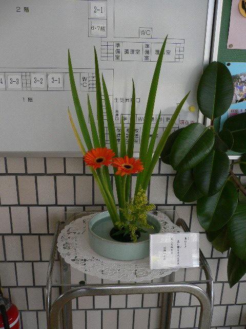 このコーナーでも何度か紹介している正面玄関の生花です。いつも地域の方がボランティアで活けてくださるのですが、本年度になってから花の名前と短歌が添えられています。本日の花はオクラレルカ、ガーベラ、ソリダコです。心安らぐコーナーです。「美(うる)はしき 花にこがるる人こそは 花にも似たる 心持つなれ」 |