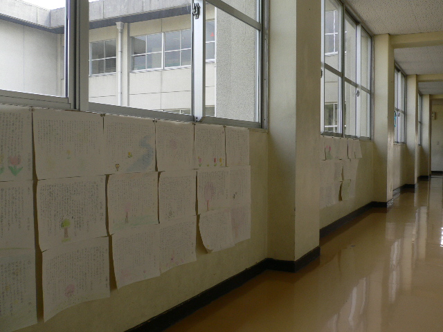 2年生の廊下に貼ってある作品です。昨日の授業参観でご覧になられた方も多いと思います。国語の授業で学習した「春に」という詩の書写とイメージ画です。詩から感じるイメージをそれぞれの生徒が思い思いに一枚の作品に仕上げました。 |