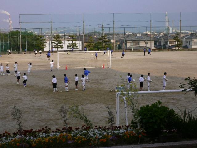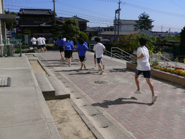 休日の部活動です。女子バスケット部は午後の試合に備えて校舎の周りをランニングしていました。汗ばむほどのいい天気で、気合いも入ります。サッカー部は藤原、野球部は中央緑地でそれぞれ試合です。 |