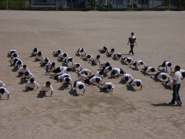 1年生の体育の授業です。準備体操のあと、腕立て伏せ・腹筋などの運動をして体をアップしていました。2・3年生は、これらの運動を授業の時間が始まるまでに自分たちで行っていますが、1年生は授業時間になってから始めていました。この1年生もじきに自主的に始められるようになることでしょう。 |