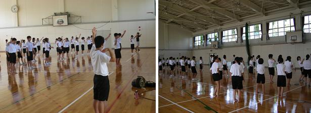 真新しくなった体育館を使って、体育祭で行う「ダンス」の講習会を生徒会メンバーが指導者となり、各クラブの代表生徒などを中心にした第1回のダンス講習会を行いました。大変暑い中ではありましたが、生徒会長の竹内君を中心とした生徒会役員がとても上手に参加者に指導を行ってくれました。 |