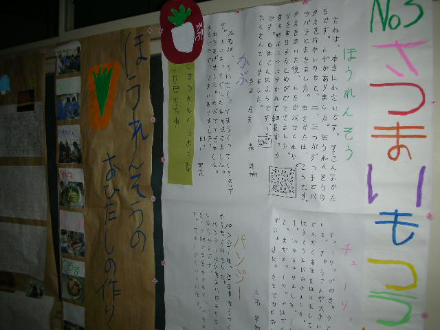 特別支援学級の掲示物ですが、内容と表現が豊かです。畑で育てているホウレンソウやカブのこと。それらの料理のレシピ。三泗地区学習発表会の感想。さらには自分の家族を紹介する英文の掲示もあります。 |