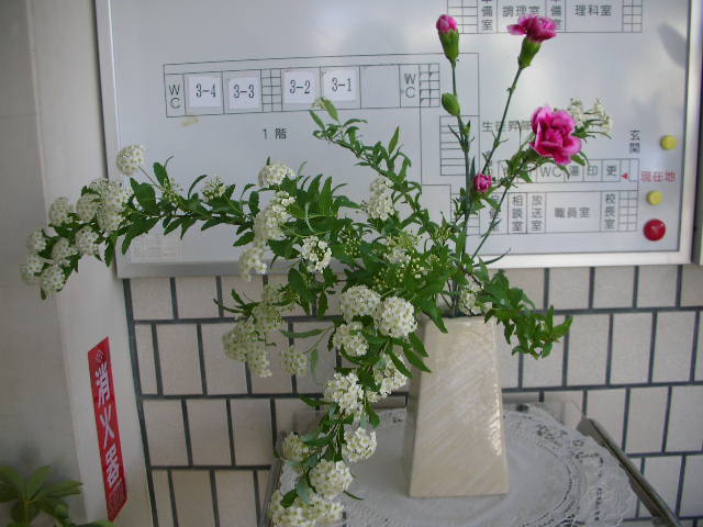 玄関の花です。活けて下さる方にお聞きしていないので、違っているかも知れませんが、鮮やかなカーネーションとたおやかなコデマリです。季節感を伸びやかに表現してくれていて、庭で見かける以上に自然な感じを受けます。 |