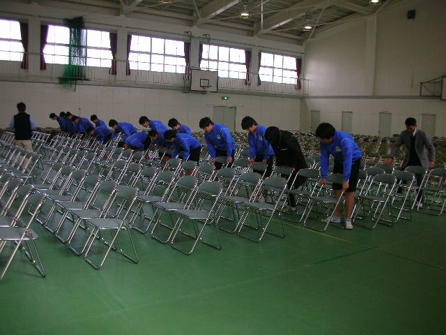 体育館内での卒業式会場設営です。2年生が午前中にクラスで分担し、力を合わせて取り組みました。写真のように、4限目の作業は仕上げに近く、並べたパイプ椅子の前後左右のラインを、メジャーを用いて整頓していました。600を超える椅子がきちっとそろうと、それだけでも厳粛な気分になってきます。 |