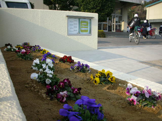 正門に入る左側を新しく花壇にしました。以前は低木の植え込みになっていたのですが、日当たりが悪くて維持管理が難しい状態でした。今回の正門改修の際に、陰を作っていた擁壁を低くし、小さ目の花壇に姿を変えました。昨日、ここに特別支援学級の生徒がご覧のように花苗を植えてくれて、華やかな正門になりました。 |