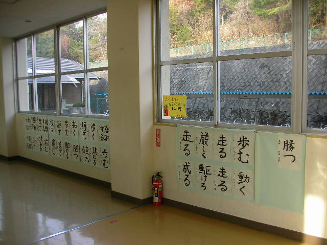 進路情報や教科の作品など、3年生関係の掲示物の多くは卒業を前に取り外されました。これは片付ける直前の毛筆作品で、今年1年の各自の抱負を「用言(動詞や形容詞)」で表現したものです。それぞれに味があります。 |