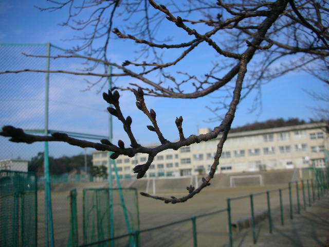 グラウンドの桜です。開花情報では4週間先になるとのことですが、今日の暖かさと夜遅くの雨で、開花が多少早まるかも知れません。今はまだまだ硬いつぼみです。 |