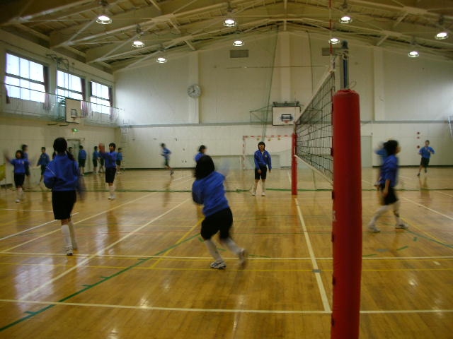 冬の朝は起きづらいのでしょう。駆け込み登校の生徒がいます。遅刻者も数名います。2〜3分早く動き出していれば、あわただしさのない一日が始まるのにと思います。 一方、早朝から元気なのが部活動で、部員の掛け声に勢いがあります。今朝の7:30からの練習は、写真手前のバレー部と、奥のハンドボールでした。 |