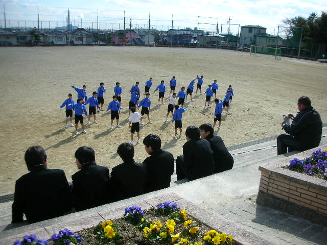 5限目の授業で、1年生の男子2学級の体育です。全員ハーフパンツで元気があります。チャイムなしの定刻に自分たちで準備体操を始めましたが、体操そのものは合格点ではなく、指導者の「やり直し!」の声で再開したところです。風邪が広がりつつあり、この授業では見学者が最も多く、6人になりました。途中、活動場面に合わせて見学位置を変えたり、補助員らしい動きもしていました。 |