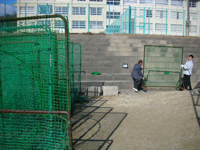 ここ数日、目立たない補修が続きました。体育館の腰窓の防球ネット、テニスコートの支柱、トイレ配水管、そして写真の野球のネットなどです。生徒から要望の出ていたものも含んでいます。これらのどれもが老朽化の進んだものでしたが、トイレの配水管以外は息を吹き返しました。今日と明日は正門の工事が進んでいきます。中断していたのですが、いよいよ終盤の工事です。 |