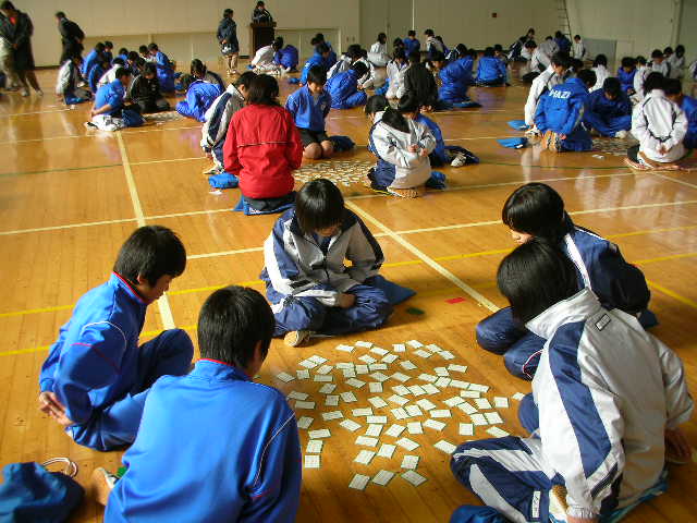 冬の体育館は フロアーから冷えてきます。各自が防寒対策を講じての百人一首大会です。会場内はゆっくりと時が流れていきます。朗詠の優雅な声が始まると、腰を下ろしている姿勢が心持ち前かがみになり、一瞬シーンとなります。これが、この行事のよさでもあります。 |