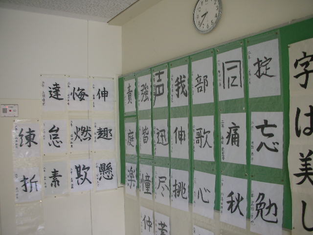 年間を通して貼ったままの掲示物もありますが、生徒作品は、そのつどこまめに貼りかえられます。先日の2年生「漢字一字」も、このように別の作品に代わっています。筆遣いと共に、選んだ一字に関心が向きます。 |