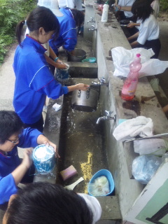 カレーを美味しく食べた後は片付けです。かまどの煤払いや用具を洗うなど、協力してやっていました。 この後は入浴、キャンプファイヤーです。 |