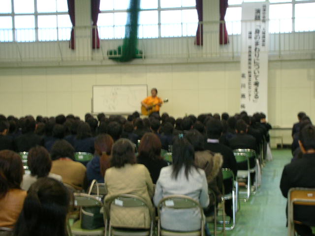 6限目に体育館で人権教育講演会を実施しました。5限目が授業参観(1,2年)と進路説明会(3年)で、保護者のみなさんも何人か引き続いてこの講演会に参加していただきました。講演は、奈良の御所市からお招きした北川亮佑さんの「身のまわりについて考える」で、ところどころにギター伴奏の歌声を織り込み、温かい語り口のわかりやすい内容で、瞬く間に90分が過ぎました。 |