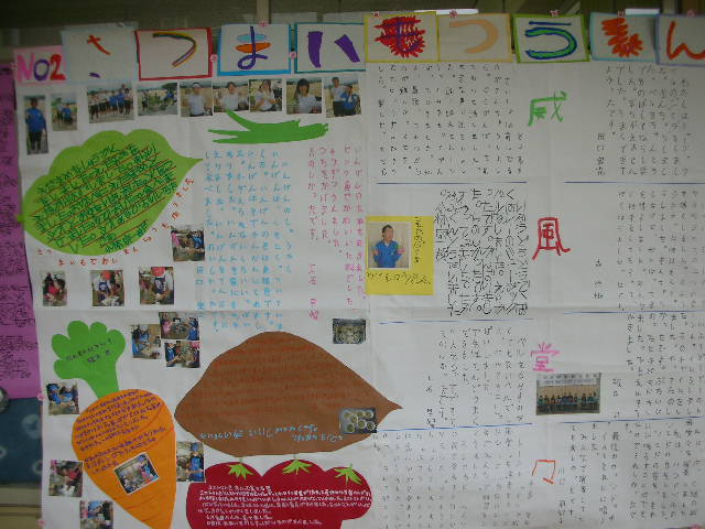 「さつまいもつうしん」は特別支援学級の壁新聞です。文化祭のステージで「威風堂々」を演奏したときの気持ち、学校菜園の作業の様子、調理実習の感想など、その時々の活動が蘇えってくる記事がいっぱいで、写真も生き生きしています。生徒作品など、数多い廊下の掲示物は時機をうかがって張り替えが行なわれています。 |