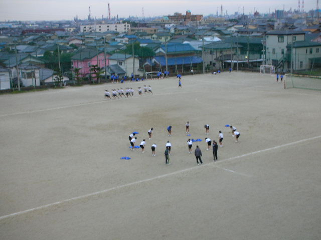 写真は人文字ではありません。駅伝練習の一場面です。平日には朝夕2回の練習を続けてきましたが、メンバー全員が一つになる場面と、力の限りを尽くして競い合う場面とが際立ってきています。1ヶ月足らずで、好ましい「部」に成長しました。今、気がかりなのは、メンバーに故障が出てきたことです。が、男女とも何とか最善の体調で明日の本番を迎え、入賞を果たす意気込みでいます。