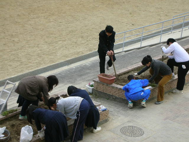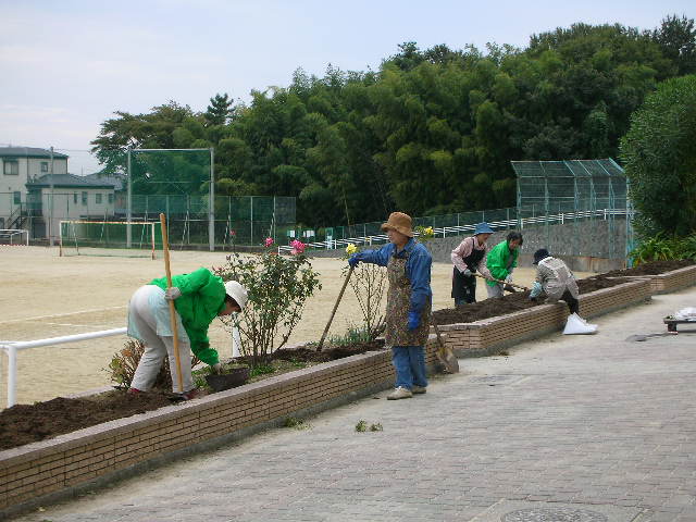 「花美好(はなみずき)」のみなさんが、グラウンドを見下ろす花壇にパンジー、ビオラ、葉牡丹の苗を植えてくださいました。2週間ほど前には、花壇に肥料を混ぜて耕してみえました。写真がそのときの様子です。それが今日の移植の準備だったわけです。実際、肥料はすっかり土になじんでいます。仕事の段取りのよさに感心します。この先、冬に向いますが、ここは温かく心和む場所になります。