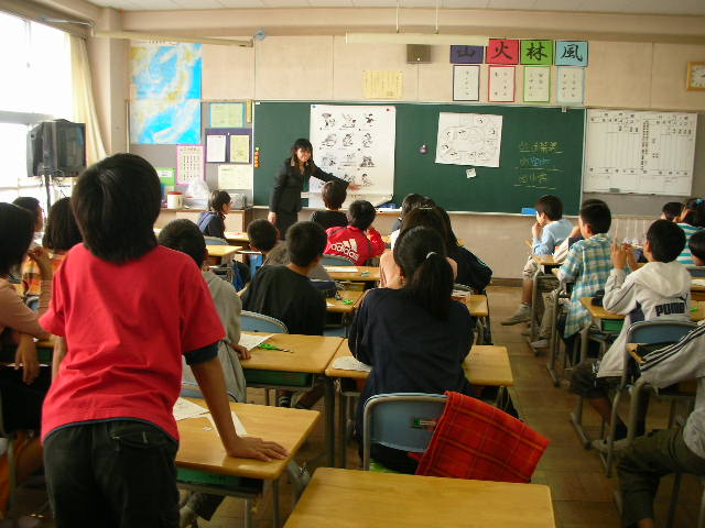 写真は5限目6年1組の初任者授業「英語」です。日常の挨拶をゲームの中で学んでいく活動と、羽津中学校の部活動の英語名を題材にしたフルーツバスケットでした。子どもたちの反応が非常によくて、動きもなかなかのものでした。