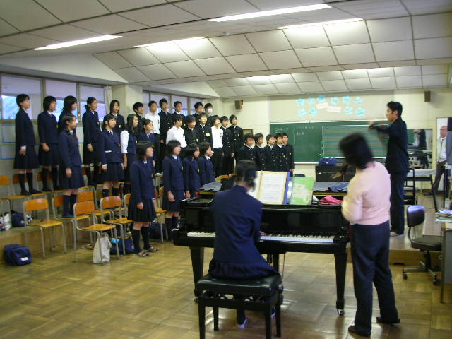 明後日の三泗音楽会に出場する3−1生徒の練習風景です。クラスの一人が欠席で、伴奏者を含む3人はちょうどこの時間にグラウンドで行われている駅伝練習に参加しています。本番が近い合唱の調整としては万全ではないのですが、校内の優勝クラスだけあって、なかなか聴かせてくれます。文化会館では、まとまりのある伸びやかな歌声をお届けできると思います。