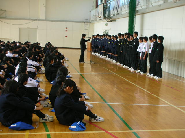 生徒会の運営で駅伝壮行会が行われました。後期役員の仕事振りも徐々にしっかりしてきています。少し緊張を感じる雰囲気の中で、指導者からの選手紹介、生徒会長からの激励の言葉、選手代表の抱負と決意などが続き、全校生徒の温かい拍手で12日当日の健闘を祈りました。