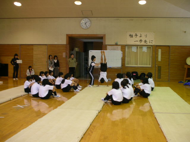 今日5限目には、通常日課の中で公開授業がありました。1年生女子体育のマット運動です。班で協力しながら「補助倒立前転」を完成させていきます。次時の「補助なし倒立前転」につなげるものです。自分ができるようになっていくのがわかり、班の友達ができるようになっていくのもわかるように、流れがうまく組まれている授業でした。指導技術を学び合おうと、武道場には10人の参観者が集まりました。