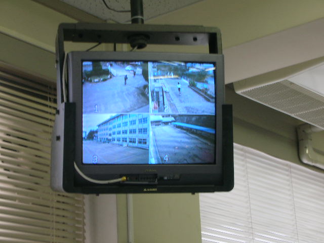 防犯ビデオのモニターテレビです。四六時中、録画がなされています。半日以上「スイッチ・オン」になっているブラウン管は働きすぎで、一般家庭のテレビほど長持ちしません。映像が紫色で、しばらくは故障に近い状態だったのですが、今日、受像機を取り替えて、自然な映像が戻りました(カメラでは多少青っぽく写っていますが)。学校近所のお家やウォーキングで近くを通られる方々とともに、このビデオも、事件・事故防止と情報提供に大きな役割を果たしています。
