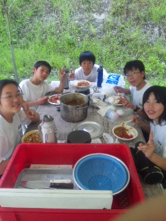 カレーもご飯も出来上がったようです。問題なく美味しく出来た班、野菜が少し固い班、ご飯が少し水っぽい班、いろいろですが、汗をかきながら一生懸命作ったご飯は格別なようです。 みんな満足げに食べています。 |