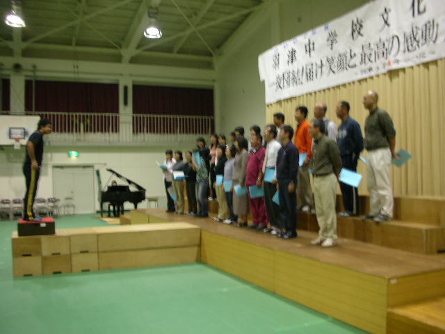 校内に歌声が流れる日々が続いています。歌うのは生徒たちだけではありません。この人たちも歌いだしました。下校時刻がとっくに過ぎた今日の体育館です。これが仕上げの練習になるか、もしかして悪天候で明日の文化祭が順延になると、誰かが、もう一回練習しようよと言い出しそうです。今の歌声が雨雲をそっと散らしてくれると嬉しいのですが。 |