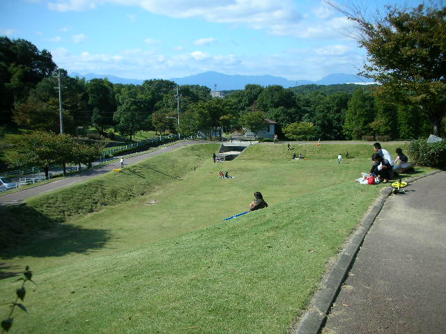 さわやかな秋空のもと、芝生に憩う人々があちこちに。子供と遊びに興ずる親、子犬を散歩させるお年寄り、周囲のウォーキングで汗を流す人もいます。数日前には管理事務所の方がバキュームで落ち葉を集めてみえました。のどかでゆったりと時が過ぎていきます。ここは「山のコンサート」の会場になる羽津山緑地。本校生徒の歌声を待っていてくれます。 |
