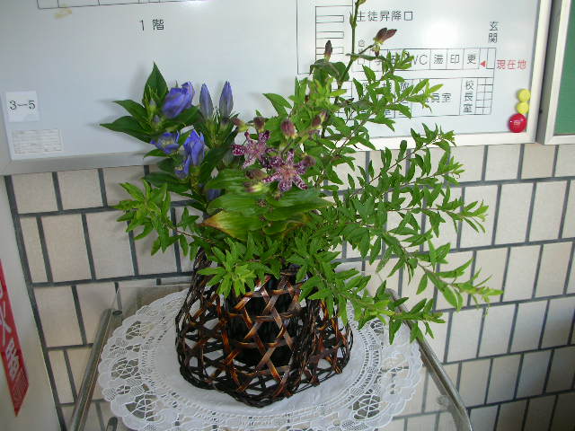 校区の八田にお住まいの方が、本校の玄関に週替わりの花を生けて下さっています。昨年の6月からずっと季節の花を楽しませて頂いているわけですが、当初のアジサイ、菖蒲、グラジオラス、ヒマワリなど、強い印象で今も心に残っています。今週はミヤマリンドウ、ホトトギス、ユキヤナギの組み合わせです。落ち着きのあるバランスで、自然よりも自然らしい生け花に心を癒されます。 |