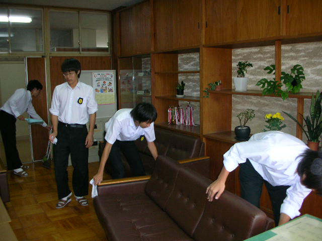 清掃は10分間ですが、初めと終わりに30秒ほどの、仕事の確認や点検のための時間をとっています。写真は職員室と掛け持ちで校長室を担当する3年生です。床を拭き終えると、テーブルとソファーを戻し、それらの位置関係を実際に座ってみて、これでよしっ!と終えているようです。「そうじ・あいさつ・ノーチャイム」は、本校の集団生活の指針です。 |