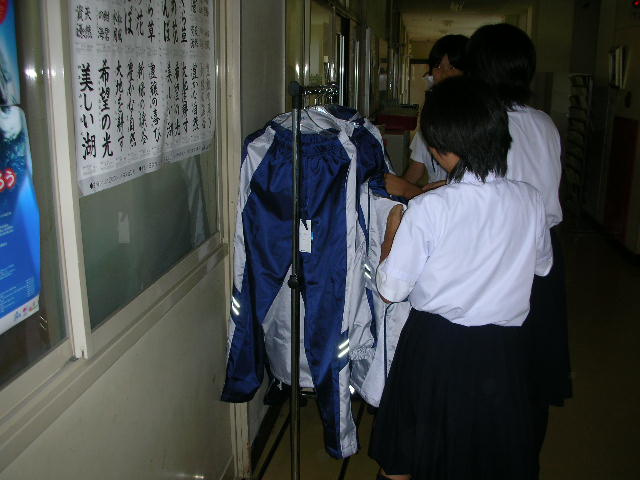 長く尾を引く「夏」のために、とても冬支度の気分にはなれませんが、ウィンドブレーカの注文の時期になっています。中体連新人大会に間に合わせようとすると、取りまとめは今の時期になるようです。昨年度にモデルチェンジした、なかなかの人気の品です。職員室前を通る生徒たちが、展示されたサイズ見本を身体に合わせていきます。 |
