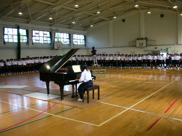 6限目の体育館です。「山のコンサート」につながる学年練習を、今日は1,3年合同で行いました。学年単独のときとは雰囲気が違います。互いに影響を与え合う生徒集団が300人規模になると迫力が出ます。L字隊形で、指揮者の左が1年生で、右が3年生です。 |