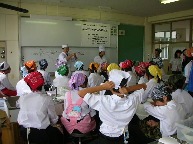 ユマニテク調理製菓専門学校から講師先生を招いての2年生家庭科調理実習です。「米飯に合う料理」としての今回の献立は、@海老の3種衣・吹き寄せあん丼、A焼きキノコのお浸し、B野菜のすり流し汁、でした。職人芸をこっそり教えていただいた時間であり、「素材の旬」、「代用できる材料」などのわかりやすい話を通して調理への興味関心が深まった時間でもありました。 |
