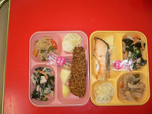 A サンマのごま揚げ B 鮭のムニエル とふかしいも、切干大根の煮付け、ハムときゅうりのサラダ、ショーロンボー、あたりめです。 この時期のジャガイモは美味しい、副菜の多さが気に入りました。不思議なのがあたりめ、これはデザートなのかおかずなのか迷いました。今日は1年生は自然教室、2年生は社会見学、しかも魚の日です。注文は少なくて残念です! |