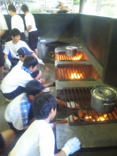 ウォークラリーは少し迷ってしまった班もありましたが、参加者全員無事に帰って来られました。昼食が終わり、これから飯ごう炊さんに入ります。 写真は、飯ごう炊さんの説明を受けている様子です。 |