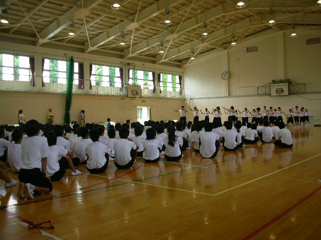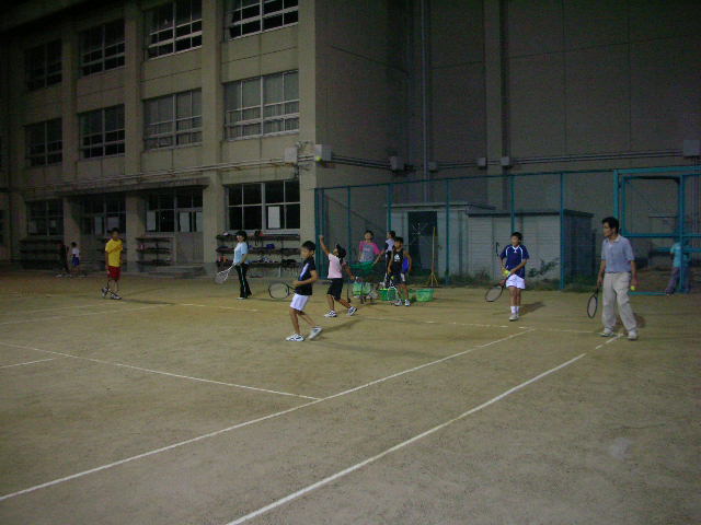 昨夜、退校時に歓声に誘われてテニスコートに立ち寄りました。木曜日は小1から中3までの団体とかで、引率のお母さんたちも、みんながテニスを楽しんでいる様子です。サーブ練習で目標の本数に達すると、がんばりをたたえる威勢のいい声がかかります。挨拶も爽やかです。笑顔が多いです。かすかに秋風を感じるナイターコートでの活動でした。 |