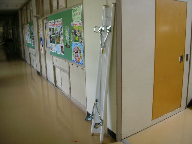 新しい担架です。この夏のプール指導時に担架が必要な事態が起こりました。幸い職員集団の迅速な対応で大事には至らなかったのですが、このとき、古ぼけた担架がずいぶん気になりました。日ごろは収納ケースに保管しているので、その状態には気づきにくい備品です。市に連絡すると、早速手配頂いて、軽くて堅牢なこの担架を納品いただきました。 |