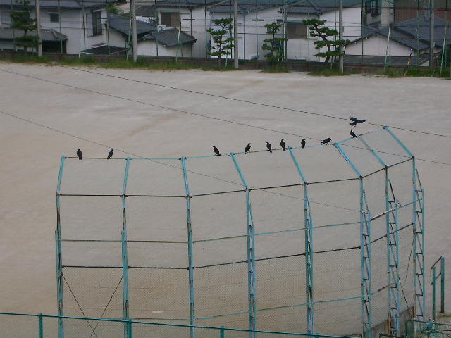 うす雲が広がり、灼熱の日差しをさえぎってくれる日が続きます。林に入り込んだり学校プールで行水する姿が多かったカラスも、こんな形で休憩しているところが目に付きます。曇ってもまだまだ厳しい今年の残暑には黒装束の集団もまいっているのでは、と思ったりします。 |