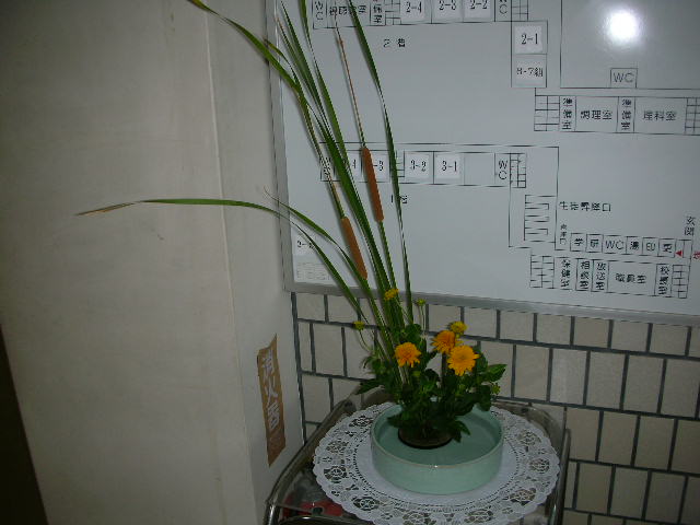 玄関ホールの雰囲気をきりりと引き締めたり、見る人の気持ちを温かくしてくれていた「季節の花」ですが、1学期最後の花は、この「ヒメガマ」でした。園芸用のかわいいガマです。沼地で見かけるのもいいですが、生けてもらってすっきりした姿もまたいいものです。思ったより長持ちして目を楽しませてくれました。 |