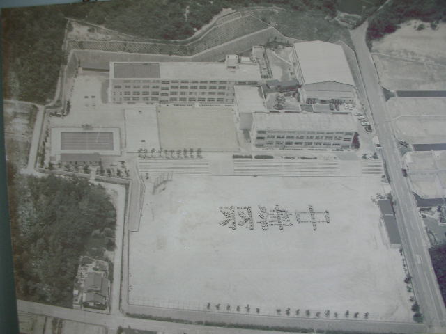 本校ホームページのライブカメラでは、手前正面に松の木が2本写ります。過去のこの航空写真ではそこに10本の松があったことがわかります。先々月、校舎屋上の木質化した草を処分しました。軽トラに2杯あり、幹は手首ほどでした。この写真ではまだ屋上はきれいです。この写真、撮影年月日は不明です。本校にかかわりの深い方ですと、「昭和○年○月ごろ」まで特定できるかも知れません。 |
