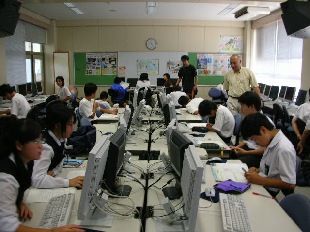 夏季休業中には、どの学年も10日前後の学力補充日(質問日)を設けています。何人もの生徒が呼びかけに応えて参加してきます。写真の日、エアコンの効くコンピュータ室はパソコン部との合同会場になり、20名を超える生徒が担当先生の支援を受けて、学習に取組んでいました。 |