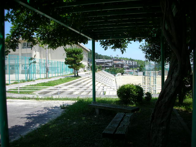 これほどのうだるような暑さですと、無意識のうちに日陰を探してしまいます。…ありました。ここはプール横の藤棚です。昭和57年8月の完成ですから、ちょうど25歳になります。春は花房の芳香を周囲に漂わせ、夏はこうして一息つける涼しさを生み出しています。 |