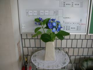 地域の方のご好意による生け花が玄関で来校者を出迎えています。グラジオラス、菖蒲、ヒマワリなど週代わりの季節の花で、今は紫陽花です。気持ちが和みます。 |