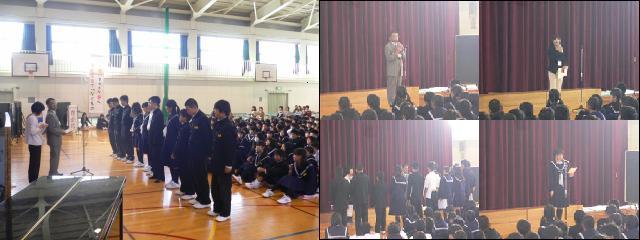 合唱コンクールの表彰式の後、生徒会代表と校長先生からのあいさつがありました。 最後になりましたが、文化祭ではとても多くの保護者や地域のみなさんに参観していただき、本当にありがとうございました。そのことは生徒たちにとって、大きな元気や勇気、喜びになったことと思います。今後とも生徒たちのさまざまな活動に対しまして、ご支援いただきますよう、よろしくお願いいたします。 |
