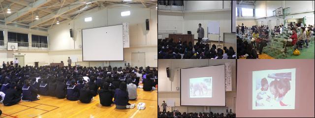 今年はじめて土曜日開催のオープンデーとあって朝から多くの保護者、地域の方に参加いただきました。3,4限目には小中合同の教育講演会、5,6限は3年生対象の進路説明会がありました。写真は3,4限目の講演会(演題「友だちって何? なかまって何? 〜すてにな自分になるために・・・」、講師:園田雅春さん[大阪教育大学特任教授])の様子です。「ぞうさんを冷蔵庫に3回で入れるとすると・・・」という話で始まりました。中学生からの手紙や大津市の中学生の言葉を通して「いじめの問題」について話してもらいました。仲間からの「だいじょうぶだ」「私は味方だから」「やったらできるって」という言葉は”こころのガソリン”となる魔法の言葉だ。元サッカー選手宮本恒靖さんがいじめっ子だった小学校1年生のときに先生に言われた「ほんまに強い子は弱い子の味方になれる子やで」、「自分だけわかっても50点、困っている仲間にアシストして75点、その結果その子が”わかった!”って言ってくれて100点」など、印象に残るいくつかの話をしてくれました。残念ながら来ていただけなかった保護者の方はぜひお子さんに聞いてみてください。 今日は5,6限目の3年生進路説明会参加の保護者も合わせると、120名超えの方に参観いただきました。本当にありがとうございました。 |