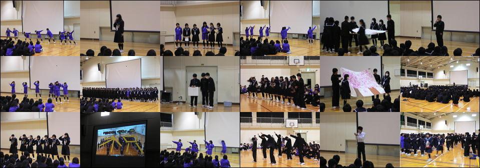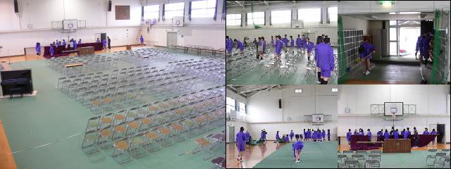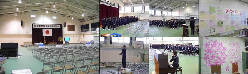 いよいよ明日、卒業式となりました。今日は1限目に3年生の卒業式練習、2限目に1,2年生の卒業式練習、3,4限目に全校での卒業式練習をしました。午後からは1,2年生で校舎内外の清掃や式場準備をしました。写真は3,4限目の様子です。これで準備万端、卒業式を迎えられます。 職員室前の廊下には「3年生を送る会」で1,2年生から3年生に贈呈した「桜の木メッセージ」と2/26からお昼の放送でずっと流していた、各先生から3年生に向けた「はなむけのメッセージ」が掲示されています。来賓のみなさん、3年生の保護者のみなさん、明日ご来校の際はぜひご覧ください。
