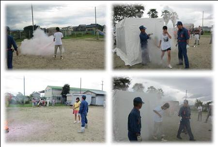 今日は上条で防災訓練がありました。ちょうど訓練のときには雨も上がり、屋外で消火訓練や煙体験をしていました。火事が起こると、室内ではすぐに煙でいっぱいになり、周りが見えなくなったり、呼吸が出来にくくなったりします。煙は上方へいきますから体制を低くして煙を吸わないようにして移動することが大切ですね。 | |